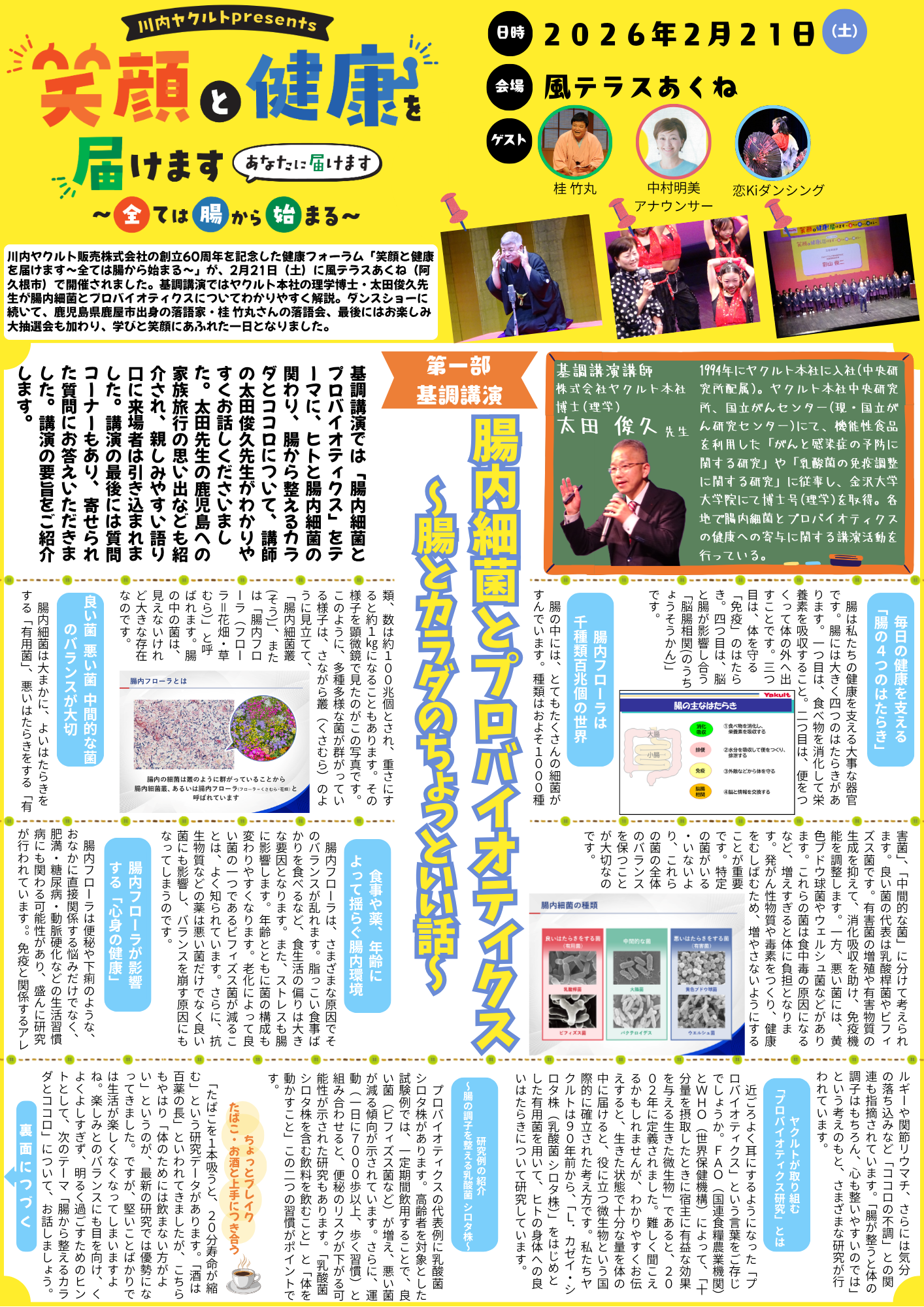 2026年2月21日、阿久根市の風テラスあくねにて、川内ヤクルト販売株式会社 創立60周年記念健康フォーラム「笑顔と健康を届けます~全ては腸から始まる~」を開催しました。